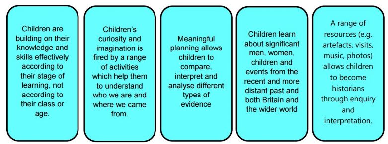 Our vision for History is to fire children’s curiosity and imagination about who we are and where we come from.  We believe that History enables children to draw comparisons and make connections between different time periods and their own lives; it gives them a sense of their place within their immediate environment and the wider world. Topics are informed by the national curriculum and are sensitive to children’s interests, as well as the context of the local area.